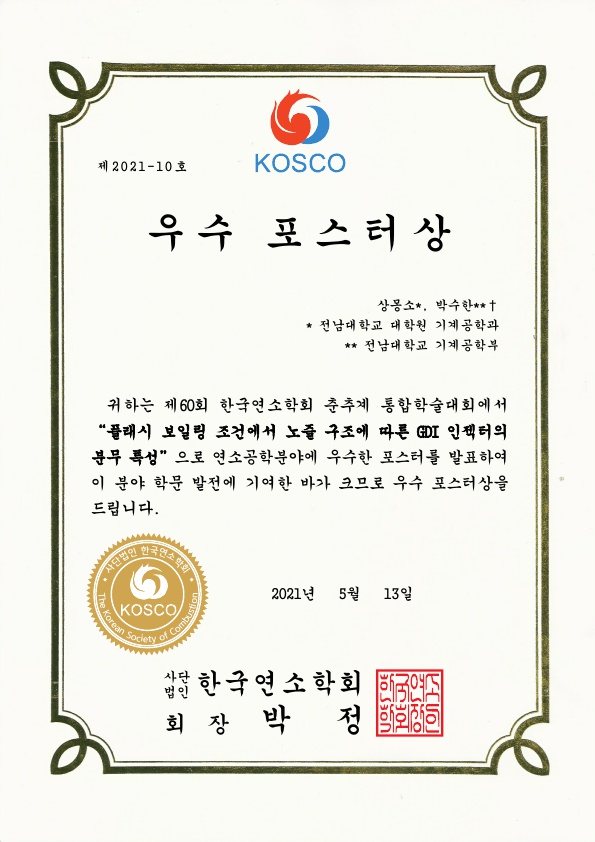 기계공학과 동력 및 에너지변환연구실(지도교수: 박수한) 박사과정에 재학중인 Mengzhao Chang 학생이 2020년 한국연소학회 춘추계통합학술대회에서 발표한 논문이 우수 포스터상으로 선정되어, 2021년 제61회 한국연소학회 춘계학술대회에서 수상하였다.