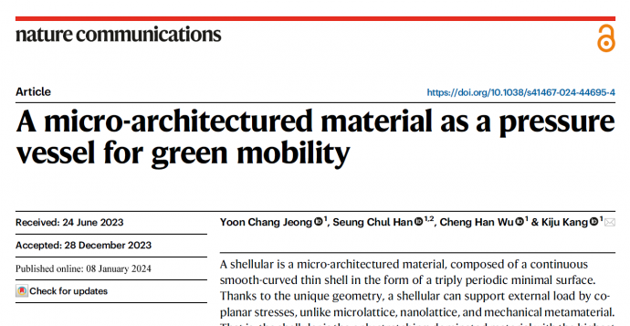 기계공학부 재료강도실험실의 강기주 교수와 정윤창 박사 등은 최근 세계적인 과학저널인 Nature Communications (영향력지수 16.6)에 신개념 압력용기에 대한 논문을 게재하였다. 산업 혁명 이래로 300년이상 사용해온 압력용기는 구형이나 원통형 형상을 가지고 있어 200기압이상의 초고압의 기체를 대량으로 저장할 경우 수십 센티미터 두께의 강철제 판재가 필요해 사실상 제조가 곤란하였으나, 본 논문에서 제시한 Shellular 압력용기를 사용하면 얇은 두께의 판재로도 고압의 대용량 기체를 저장할 수 있어 연구의 우수성을 인정받았다.