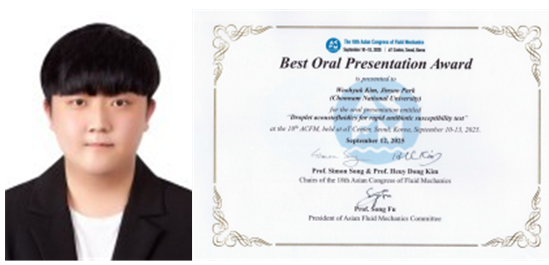 기계공학과 김우혁 박사과정(지도교수 박진수)의 학술대회 발표 논문(“Droplet Acoustics for Rapid Antibiotic Susceptibility Test”)이 2025년 9월 서울 aT 센터에서 개최된 The 18th Asian Congress of Fluid Mechanics (ACFM 2025) 국제학술대회에서 Best Oral Presentation Award로 선정되었다. ACFM은 1980 년 인도에서 시작된 아시아 유체역학 분야의 최고 권위를 지닌 국제학술대회로, 아시아 각국 및 지역 간의 과학⋅기술 교류와 협력을 촉진하기 위해 지속적으로 개최되고 있다. 이번 학술대회에서는 다양한 유동 및 유체 내 입자 제어 기술, 첨단 유동가시화, 데이터 기반 유체역학 기술 및 이를 활용한 생명⋅의학 분야와의 융복합 연구를 다룬 다양한 발 표가 이루어졌으며, 세계적으로 저명한 연구자의 특별 강연도 함께 진행되어 총 400편 이상의 연구 논문 발표가 진행되었다.