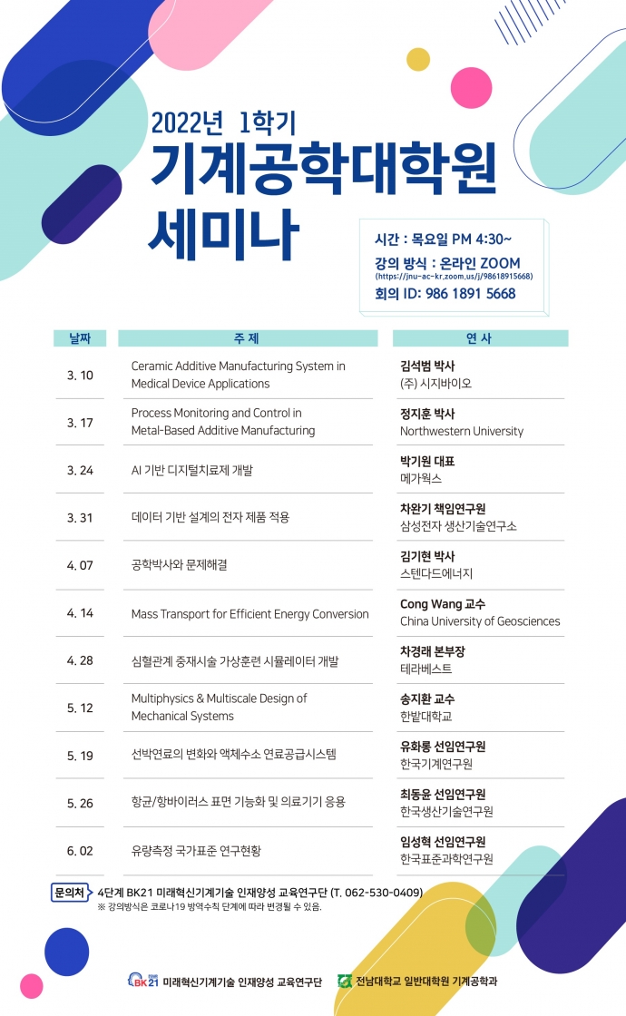 The spring semester of 2022 Mechanical Engineering Graduate School Seminar is an event hosted by the BK21 Education Research Center, and participation points(0.1 points/case) will be reflected in the evaluation of participating graduate students.